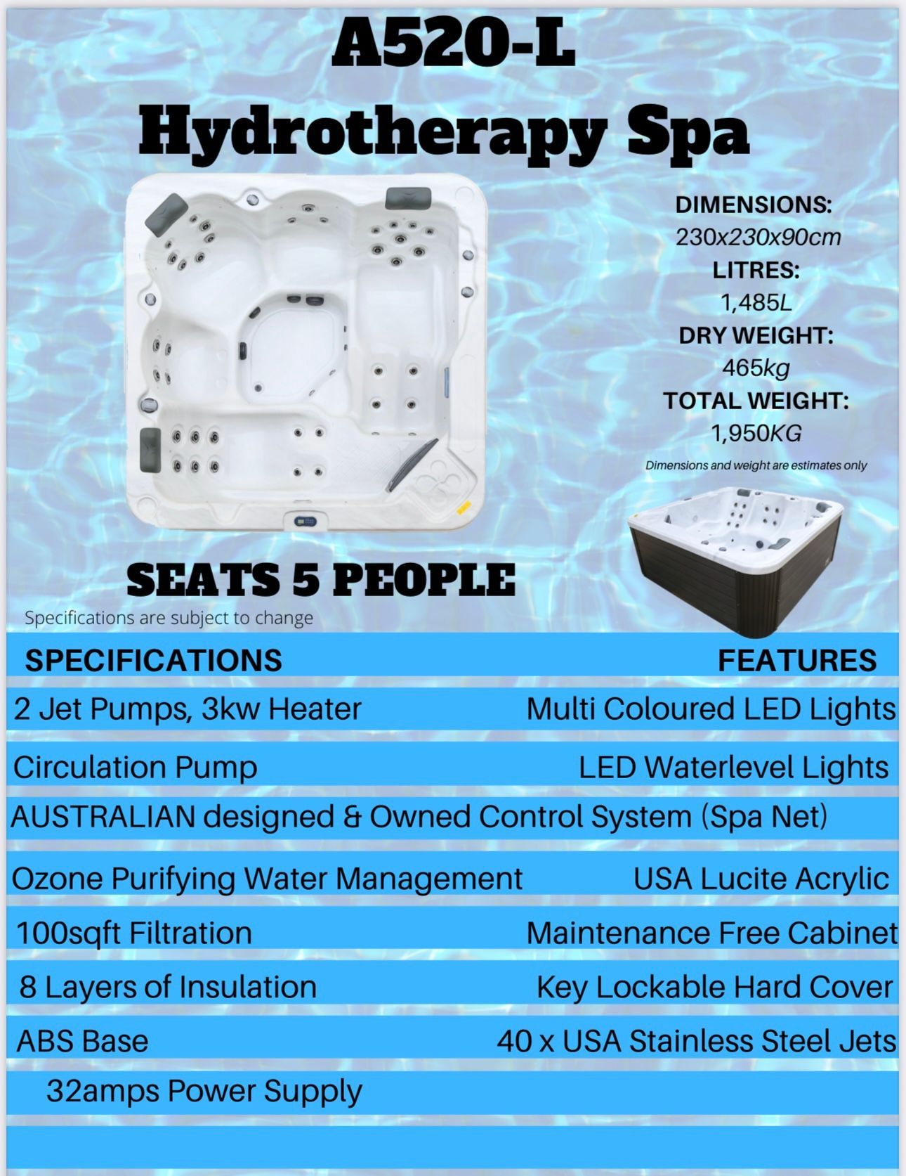 * Measures 2m x 2m x 850mm high. Quality SPANET SV3 control system, powerful 2 x 3 HP booster pump for strong massage jets. UV and Ozone sanitisation system for easy maintenance.