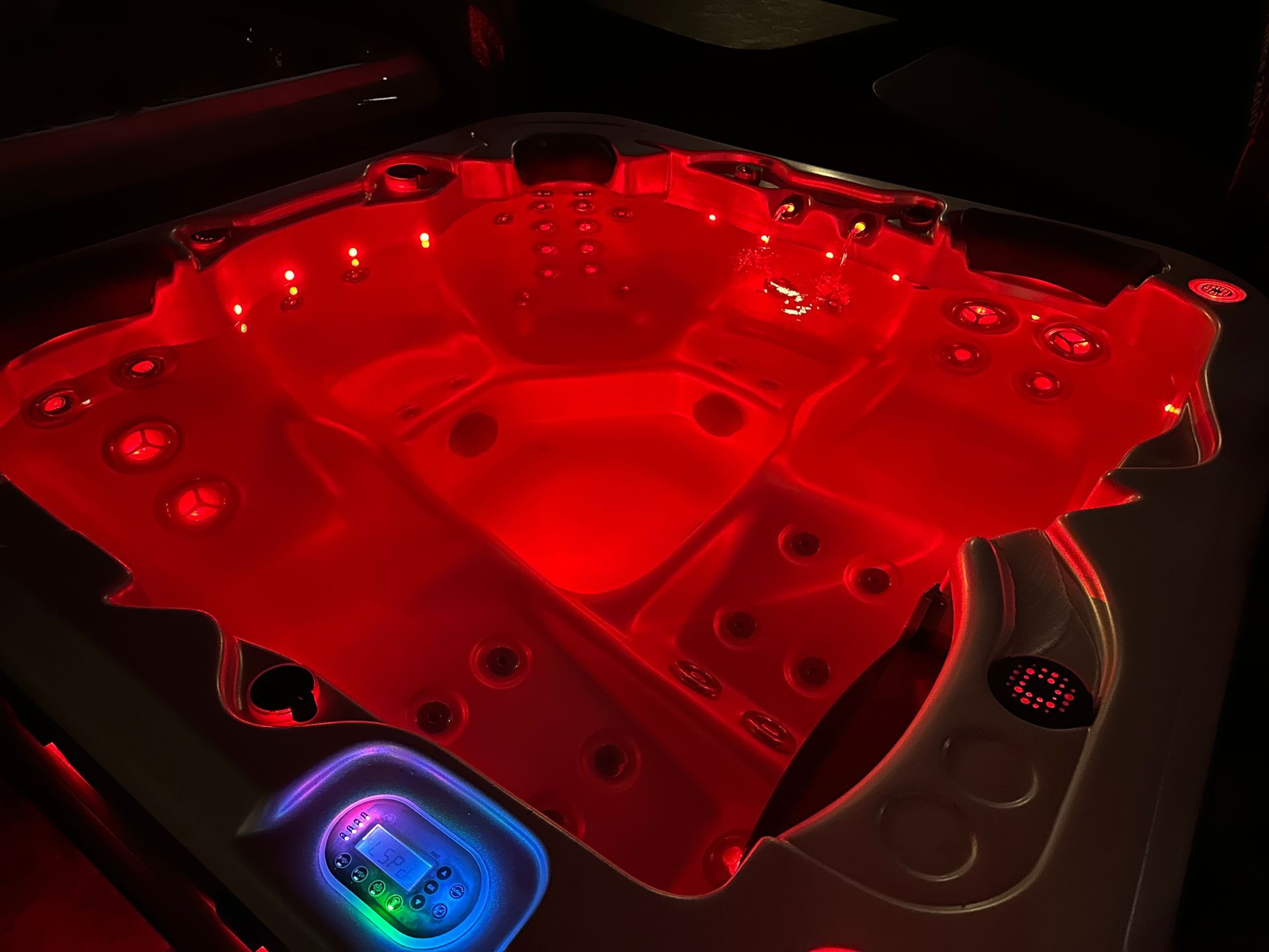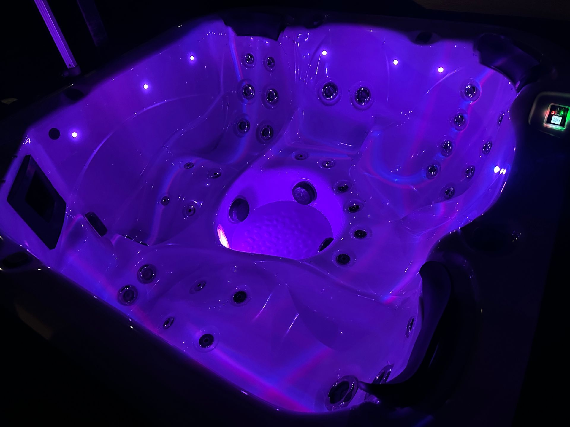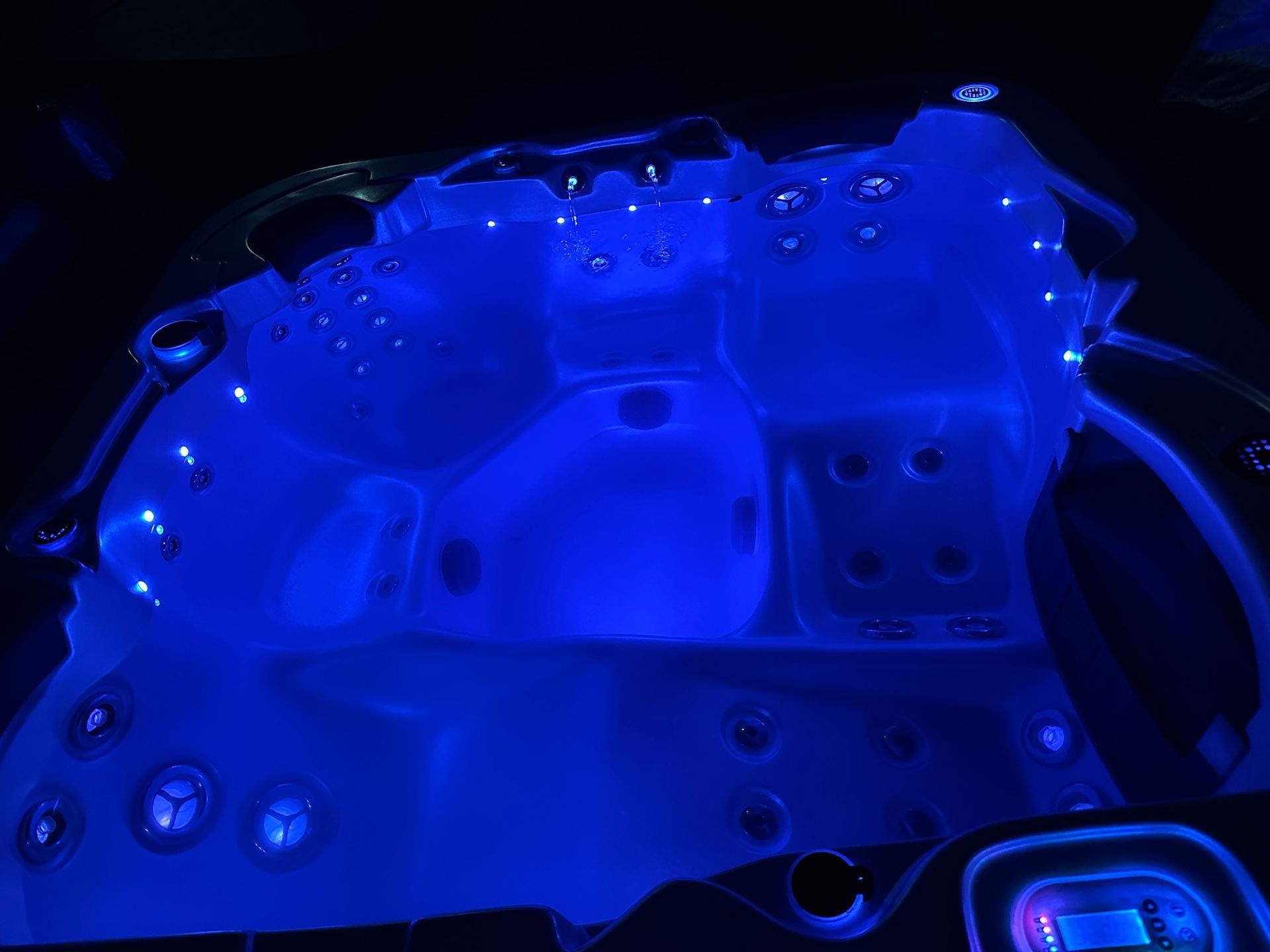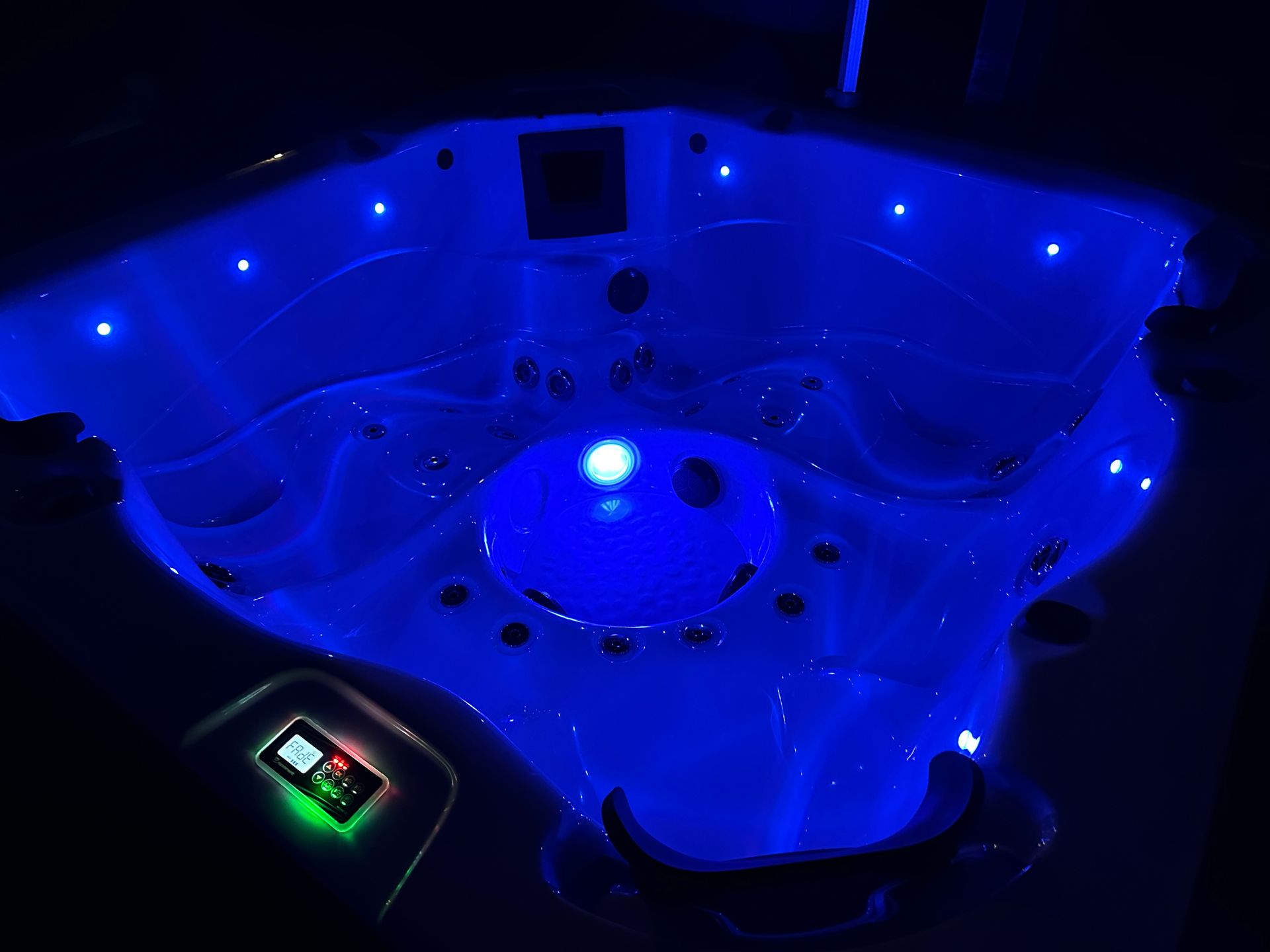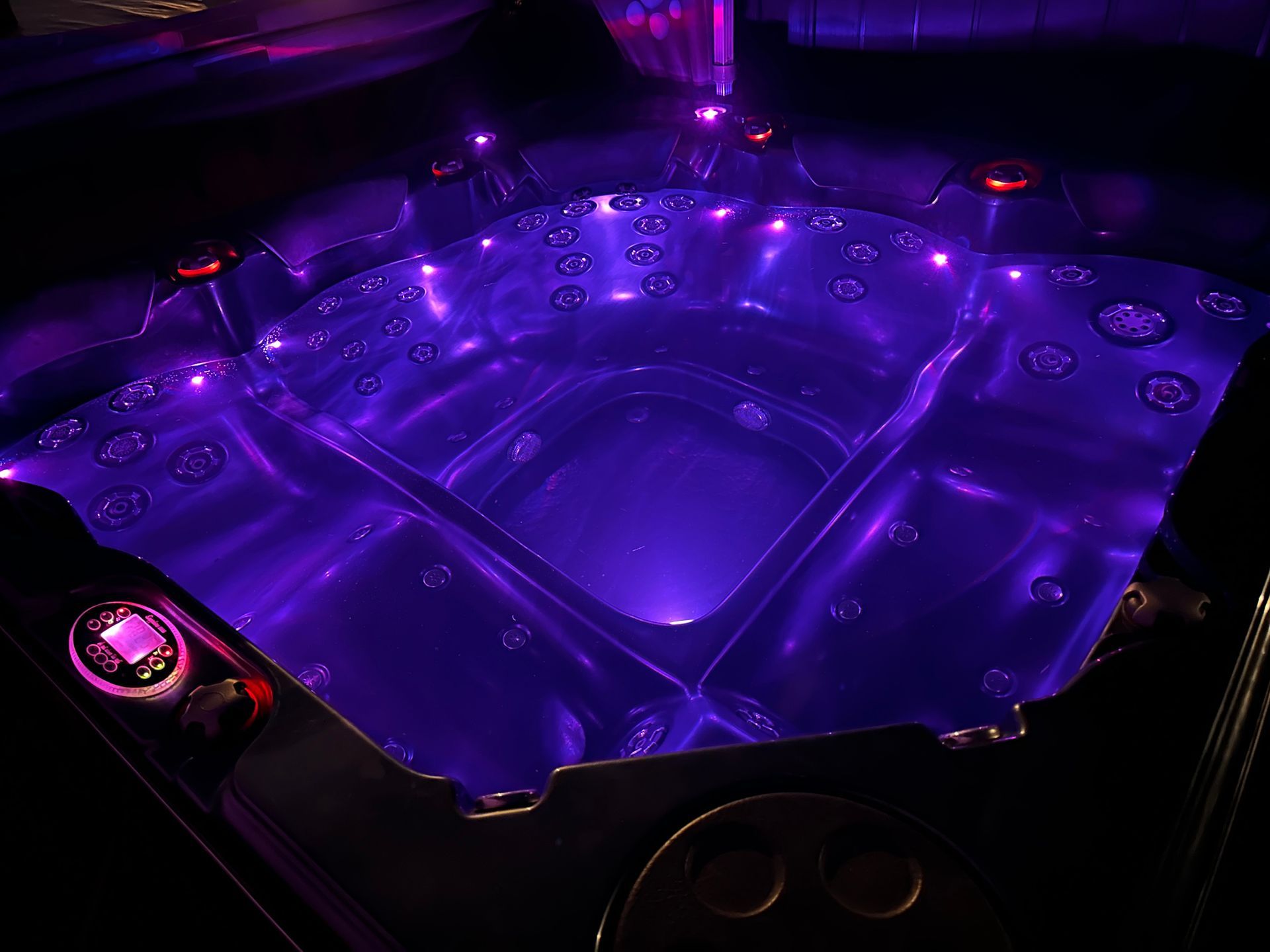 * Separate small circulation pump for efficient filtering and heating. 51 x chrome jets, backlit headrests, LED colour-changing cabinet strip lighting, 4 x backlit waterfalls, and perimeter lighting!!